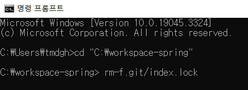 3. rm -f .git/index.lock 명령어를 입력한다. 작동되지 않으면 del .\.git\index.lock 명령어를 입력한다.